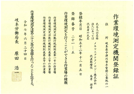 作業環境測定法第33条、同法施行規則第53条に基づく作業環境測定機関(岐阜労働局長登録)