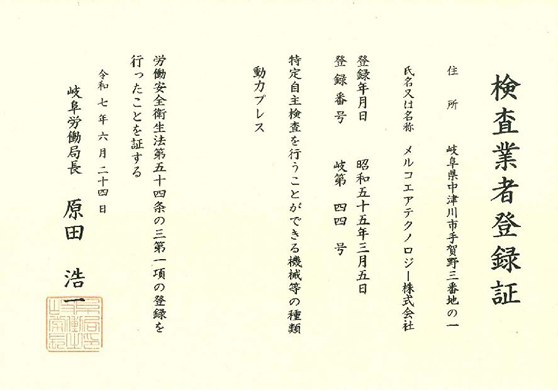 労働安全衛生法第45条第2項に基づく特定自主検査を行う検査業者(岐阜労働局長登録)